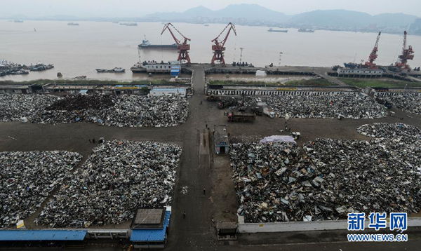 5月5日,在台州市椒江区海门港码头,货场上堆放着用于拆解的进口废物原料